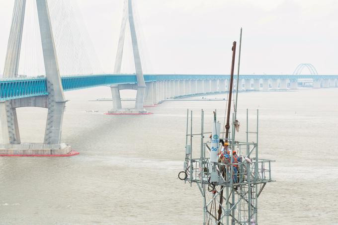江苏移动网络施工人员在沪苏通长江公铁大桥侧建设5G网络